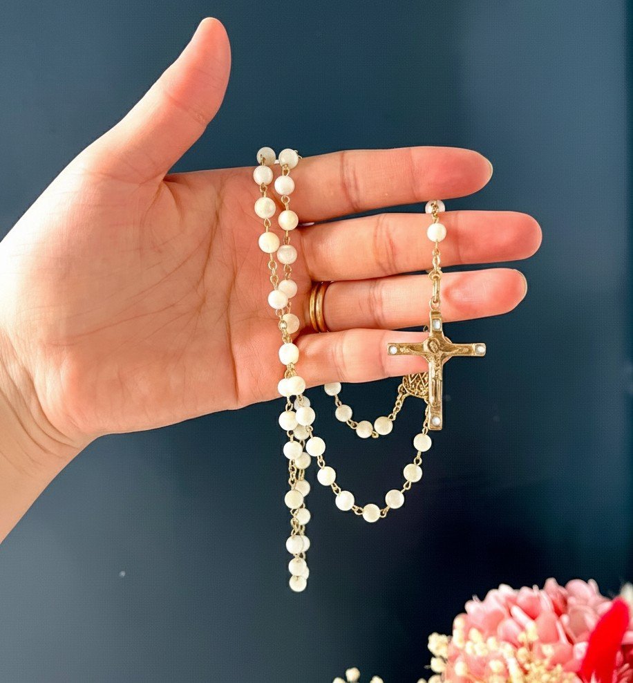 Chapelet en perles de nacre et chaine dorée et Crucifix en bronze et cabochons en émaux véritables, blancs rectangulaires.