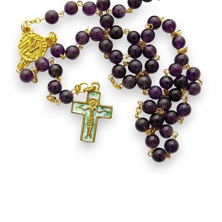 Chapelet en perles d’améthyste naturelle 6 mm avec une croix émaillée en bronze et émaux verts d’eau et le Christ.