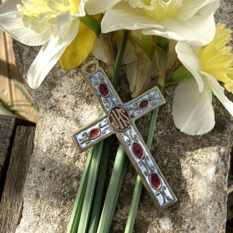 Les couleurs des émaux, dominant en blanc avec des accents en rouge et vert, sont disponibles également en bleu, offrant une palette de choix pour personnaliser l’espace sacré de chacun. La répétition du motif sur les bras de la croix confère à cet objet religieux son caractère distinctif, rappelant les ouvrages précieux de l’époque médiévale.