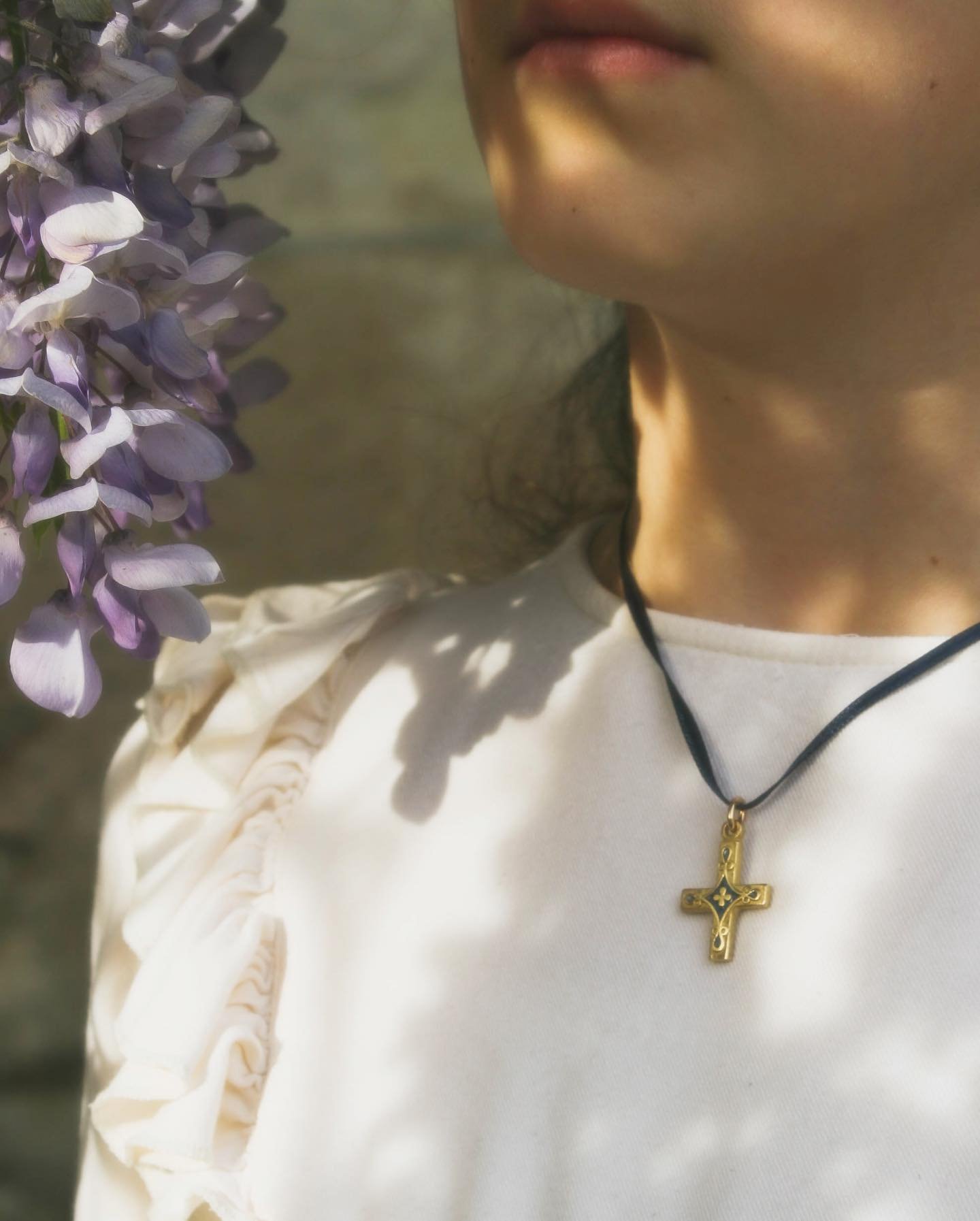 Ce pendentif croix trèfle, d’une dimension de 3 cm, en bronze émaillé est un bijou religieux d’une haute qualité esthétique.