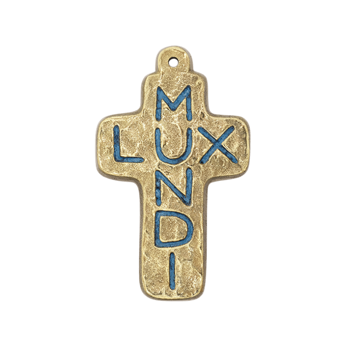 Croix en bronze, avec l’écriture biblique Lux Mundi gravée dans la masse.