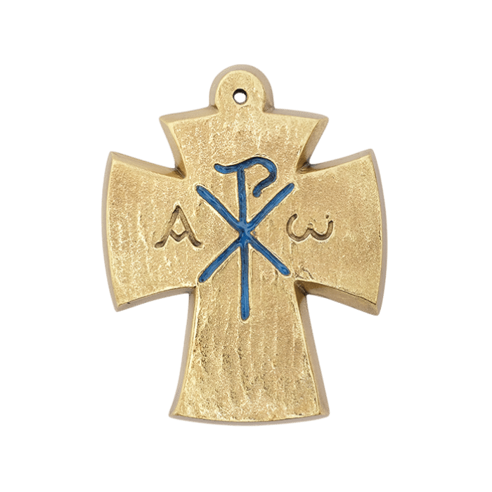 L27 – Alpha, Oméga, Chrisme sur croix en bronze émaillé – 9,4 cm