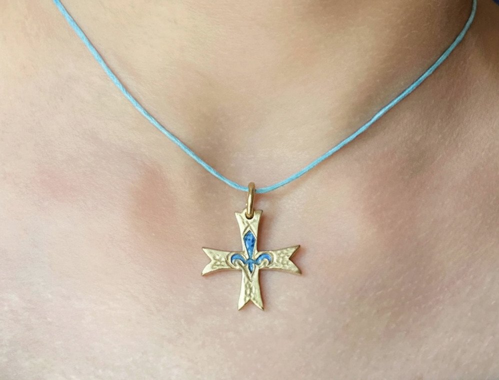 Fond émaillé bleu ou vert pour cette fleur royale finement stylisée, en incrustation sur une croix en argent.