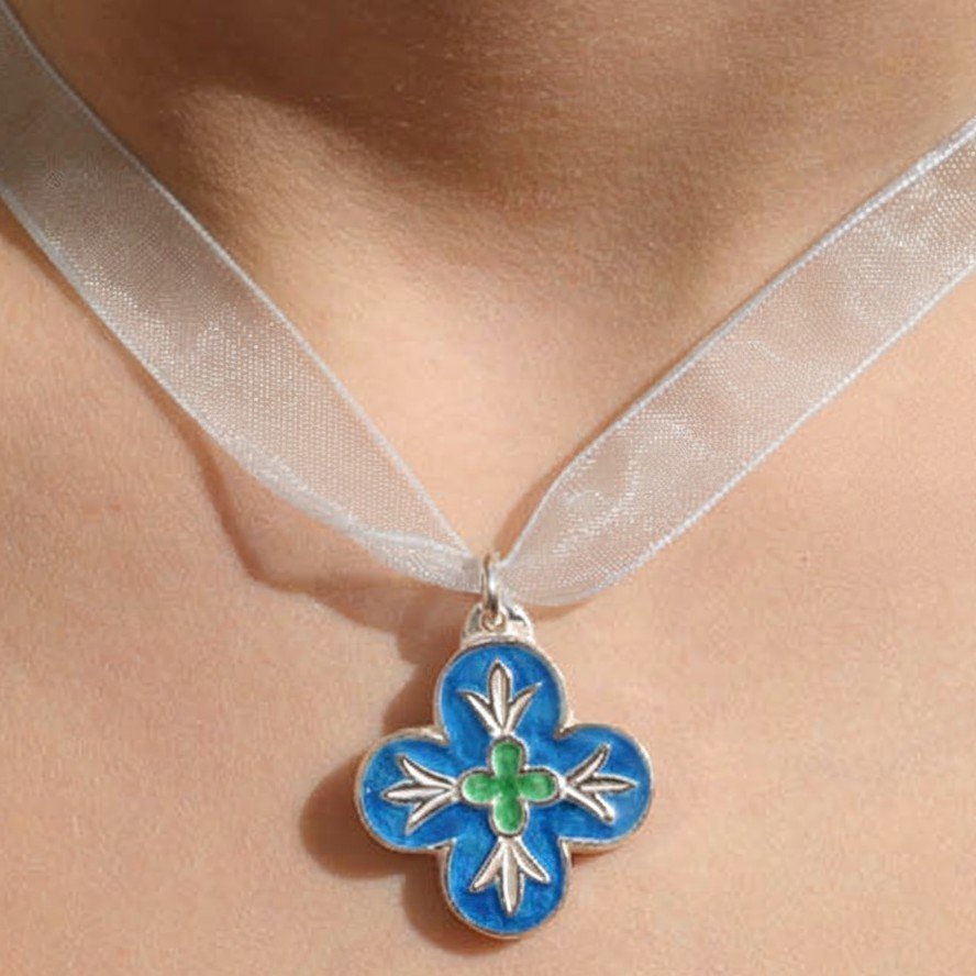 Pendentif émaillé en deux couleurs : soit fond bleu et centre vert, soit fond vert et centre bleu.